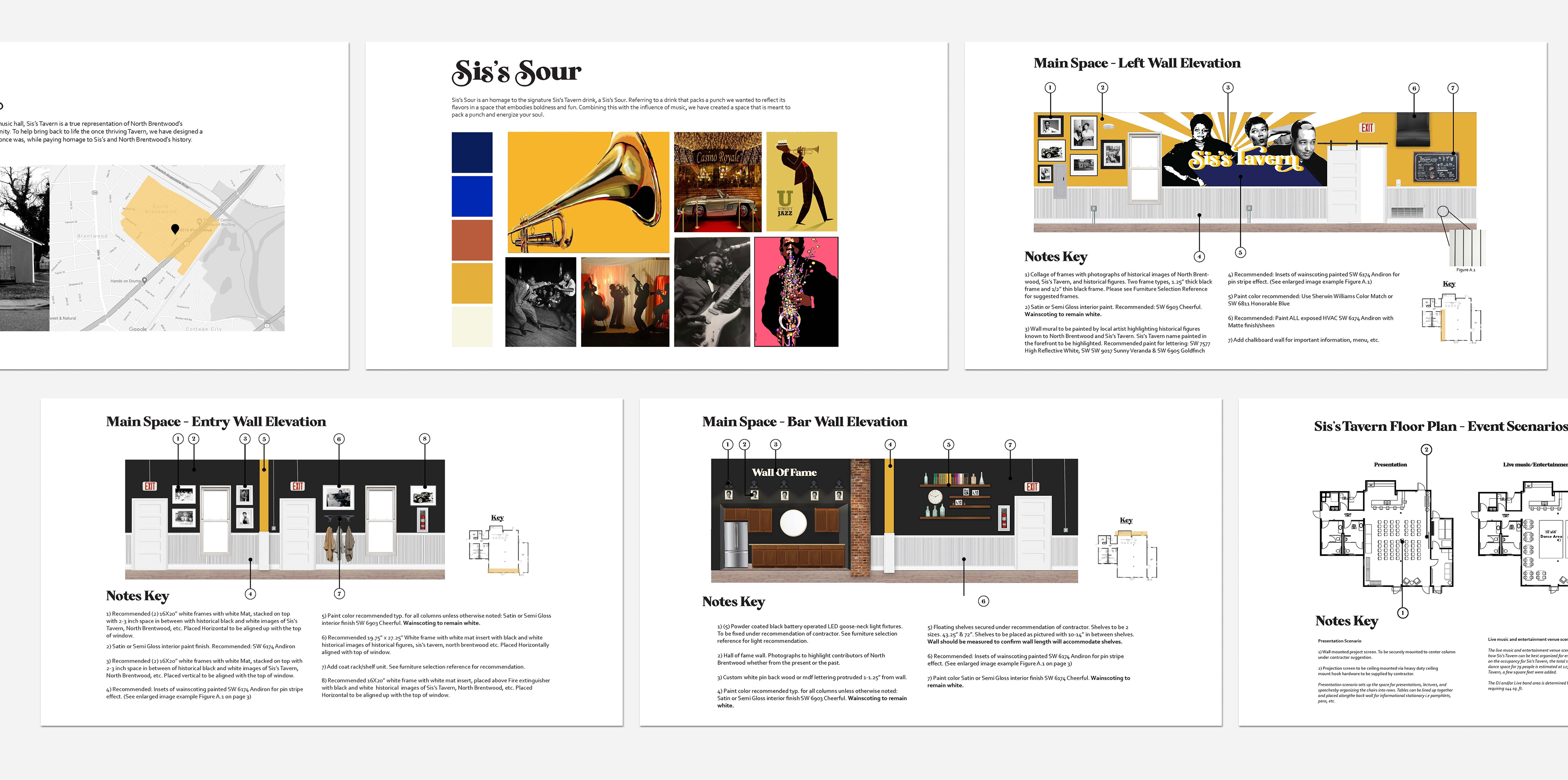 Following an engagement session with the North Brentwood community and stakeholders, it was clear that the vision was to bring Sis’s Tavern back to life with the same energy it once held as a beloved juke joint. This mood board captures that spirit—featuring bold hues, archival black-and-white images of Buddy Guy and joy on the dance floor, and a visual rhythm that echoes music, movement, and legacy. Every image was chosen to reflect the vibrancy, soul, and cultural pride we aimed to weave back into the space.